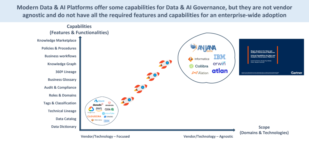 Por otro lado, las Plataformas de Gobierno de Datos & IA independientes y transversales, reconocidas como categoría propia por Gartner, donde se sitúan soluciones como Collibra, Informatica, Atlan, Alation, Erwin, DataGalaxy… y Anjana Data Platform.