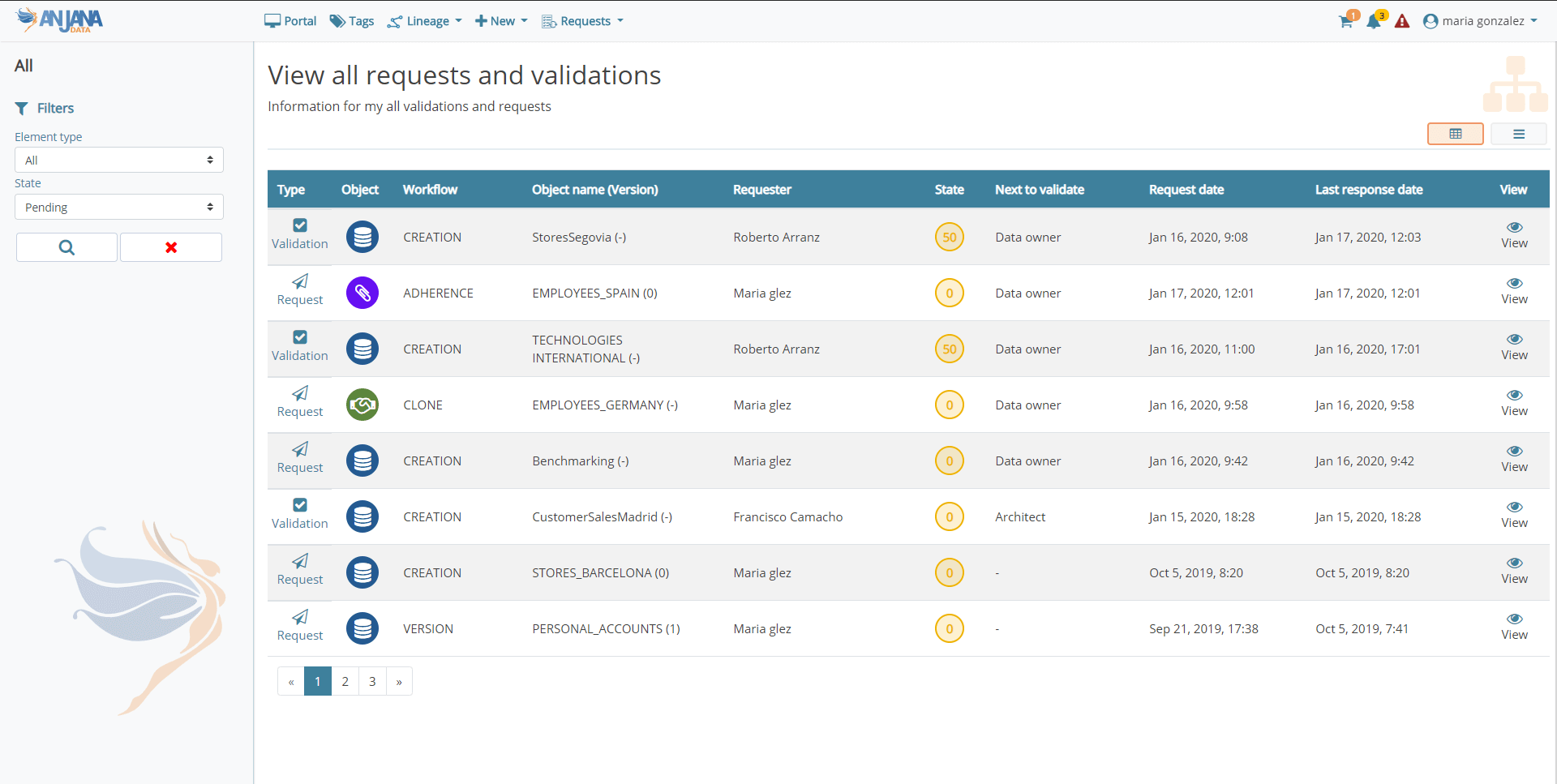 Con la premisa de entregar una versión de fácil usabilidad y que cumpla con la función de ser la solución central para el gobierno de los datos en una organización, Anjana Data presenta mejoras de experiencia e interfaz de usuario mediante cambios sustanciales en diferentes pantallas de la aplicación como el Portal de Datos, las vistas de detalle de los objetos, los grafos de linaje, la gestión de los workflows y el Panel de Administración.