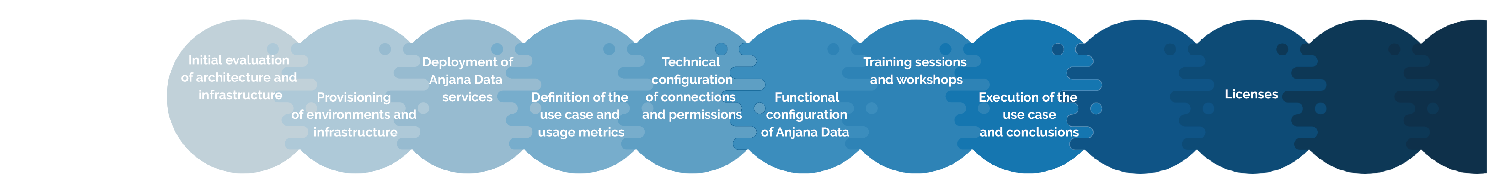 The implementation of Anjana Data is not reduced to the technical tasks necessary to install the platform, but we seek to cover the end-to-end from a preliminary analysis to the realization of a first use case in production that allows us to obtain the first measurable results. Thus, to achieve this objective, we follow a series of steps that can be grouped into the following blocks: