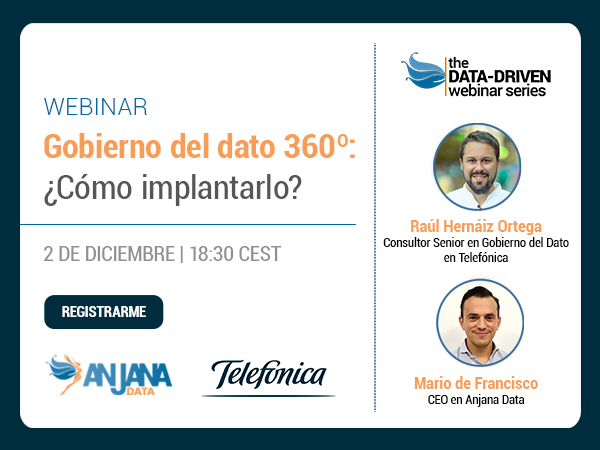 Anjana Data & Telefónica se unen para presentar este webinar con Mario de Francisco, CEO en Anjana Data, y Raúl Hernáiz Ortega, Consultor Senior en Gobierno del Dato en Telefónica, quienes comentarán acerca de la visión 360 de la gestión y gobierno de los datos en una Organización.