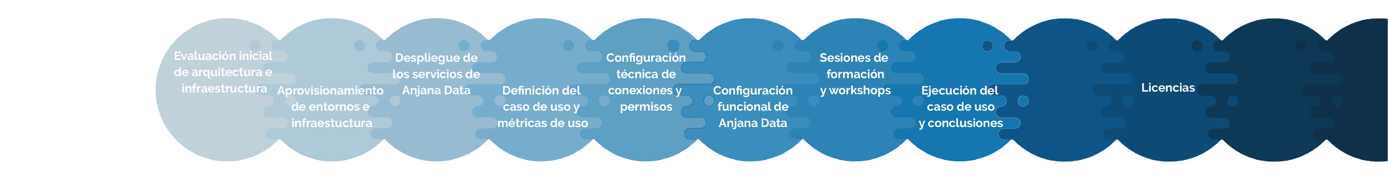 La implantación de Anjana Data no se reduce a las tareas técnicas necesarias para instalar la plataforma sino que buscamos cubrir el end-to-end desde un análisis preliminar hasta la realización de un primer caso de uso en producción que nos permita obtener los primeros resultados medibles. Así pues, para alcanzar este objetivo, seguimos una serie de pasos que podemos agrupar en los siguientes bloques: